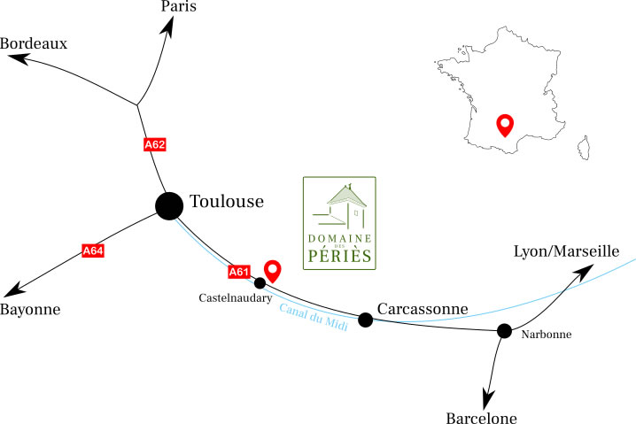Le domaine des Périès est situé à 1,5 km du canal du Midi, à la hauteur de l'écluse de Guerre.C'est une étape idéale pour découvrir ce patrimoine historique, classé au patrimoine mondial de l’UNESCO.